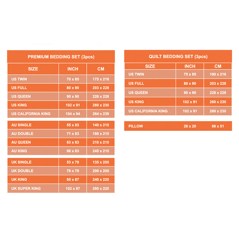 - The bedding set comes with one duvet cover and two pillowcases (Single just has 1 pillowcase). The quilt bedding set includes 1 quilt and two pillowcases. Comforter and pillow inserts are not included.